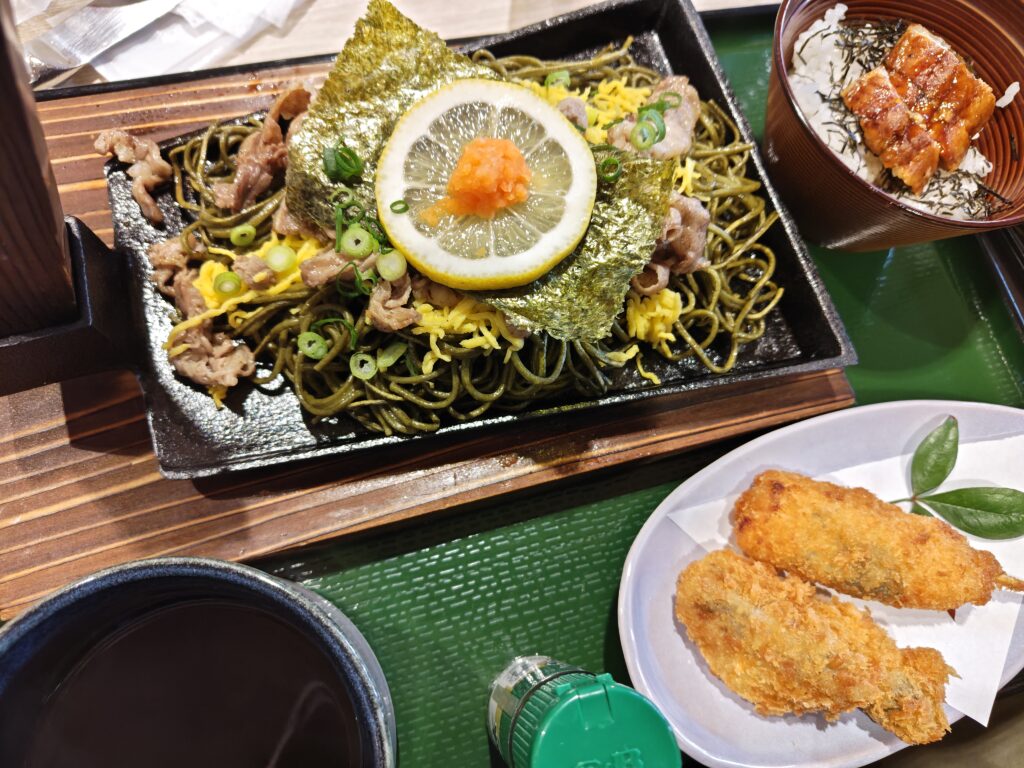 【八女茶の鍬(くわ)そば】鍬の上に瓦そば風のそばが盛ってありとてもユニークな形をしていました。