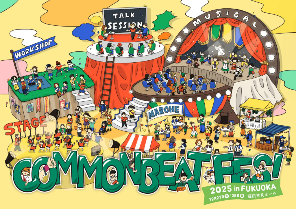 NPO法人コモンビートが、2025年12月27日(土)・28日(日)、ミュージカル「A COMMON BEAT」第66期九州公演にあわせ、表現活動を通じて地域社会とつながる新企画「COMMON BEAT FES(コモンビートフェス)」を福岡市民ホール および須崎公園で開催します。