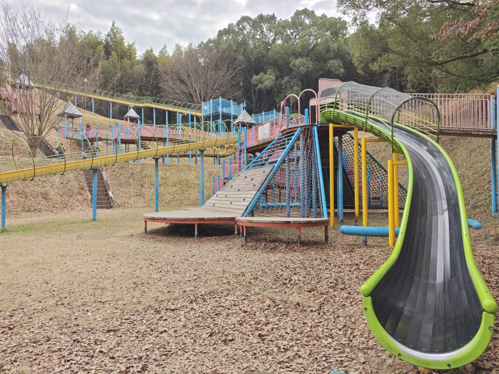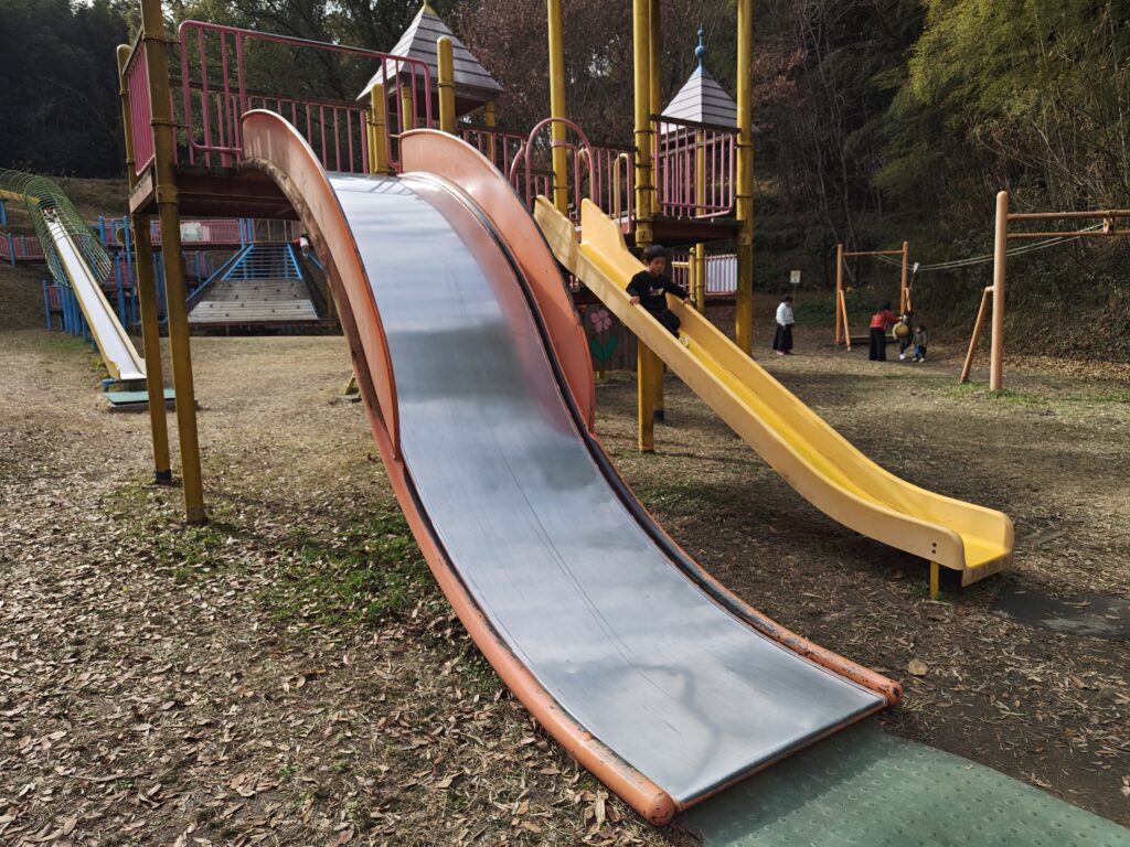 福岡県みやま市にあるこちらの公園は、住宅街を抜けた場所に位置し、たくさんのすべり台が楽しめました。