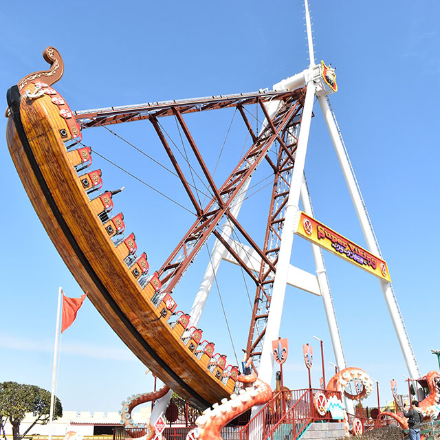 伝説の海の怪物「クラーケン」に襲われる!?大きく揺さぶられるバイキング船に乗って海賊気分を味わおう!リニューアルして身長110㎝以上あれば保護者同伴で乗れるようになりました。