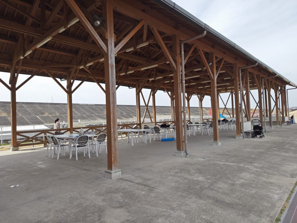 屋根付きの休憩スペースや目の前に広がる芝生スペースでピクニックを楽しんでいる家族連れも多くみられました。