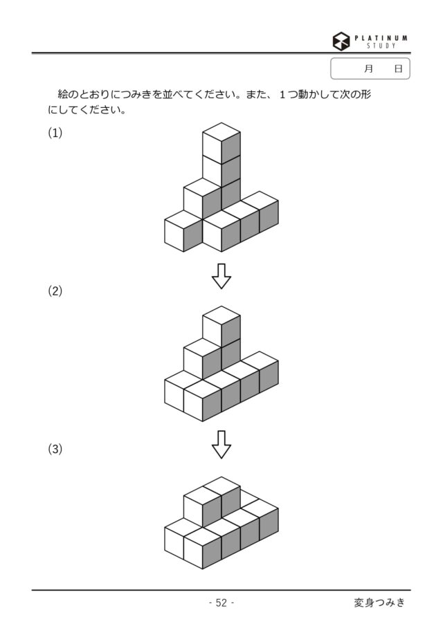 プラチナム学習会では、積み木やブロック、パズルなどを自分の手で動かして、「数」の概念を「量」としてとらえる力を身に着けます。どんな数も量として、イメージすることで、自由に動かせる想像力とイメージを組み合わせて、未知の課題解決に立ち向かう地頭力を養うのです。