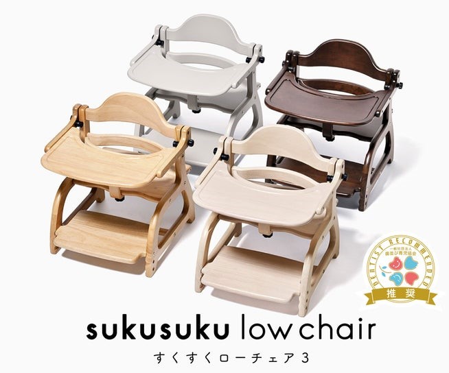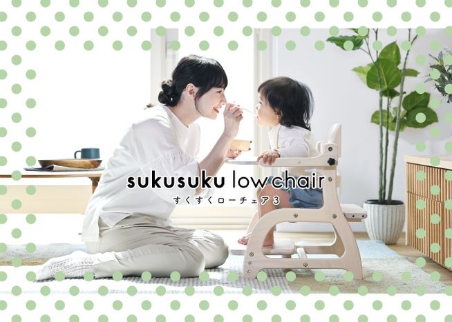 「すくすくローチェア」は、お客さまの声をもとに2000年から進化を続けてきたベビーチェア「すくすく」シリーズのローチェアで、座りやすい座板の形状や工具なしで取り外しができる安全ガードなどハイチェアと同等の機能をほぼそのまま取り入れた商品として、腰が据わった7か月ごろから5才ごろまで長く使うことができます。