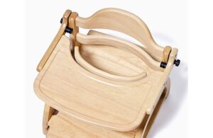 今回は「すくすくローチェア」の3代目モデルとして、食べこぼしが落ちにくいテーブルの形状を採用。テーブルのロック機能のつまみを大きく使いやすくし、脚フレームの安定性をさらにアップ。